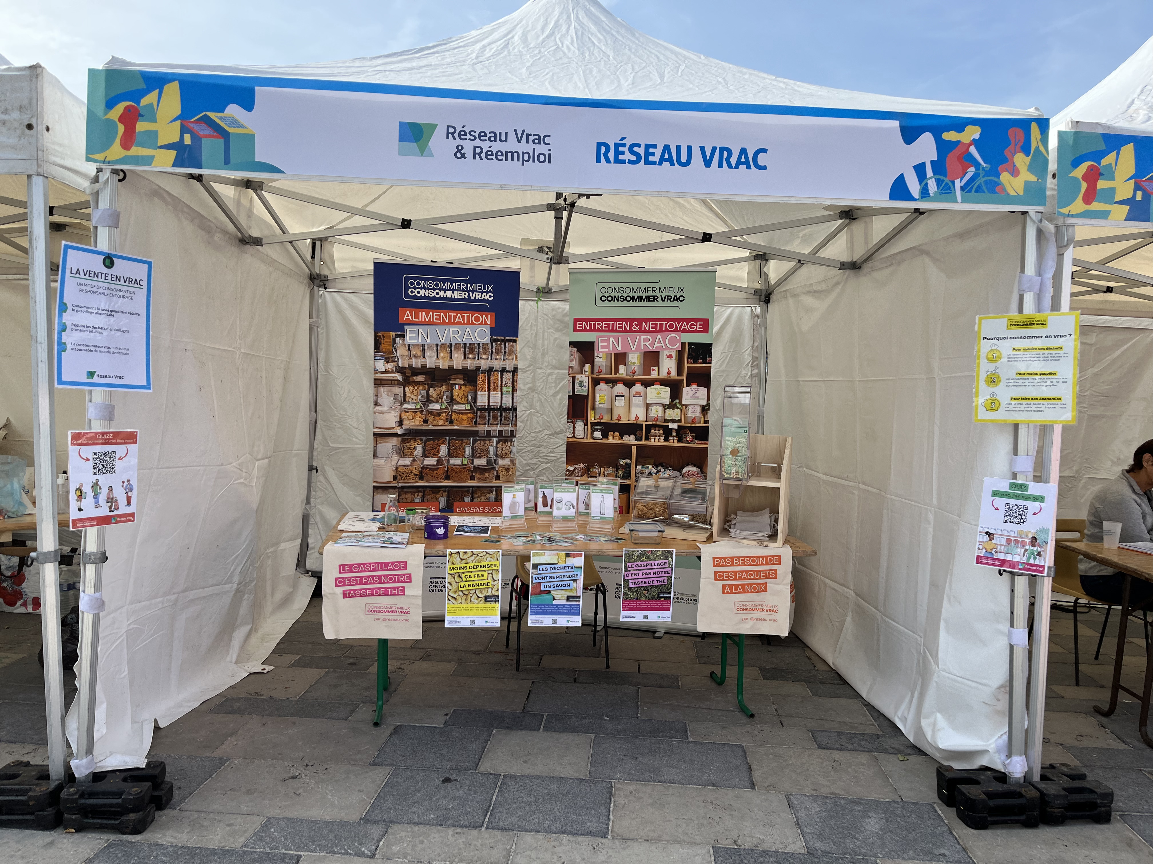 Réseau Vrac et Réemploi a ainsi été invité à tenir un stand de sensibilisation dans le village du développement durable, et plus précisément au sein du pôle "Réduction des déchets". C’est sous l’identité Consommer Mieux Consommer Vrac que la chargée de mission vrac et réemploi pour la région Centre-Val de Loire a présenté aux citoyen·nes les actions menées dans le cadre de la convention de partenariat. Dans une ambiance joviale et sous un beau soleil, une soixantaine de personnes est venue se renseigner sur la filière vrac et réemploi, et découvrir, via des animations ludiques, la diversité des produits que l’on peut trouver en vrac.