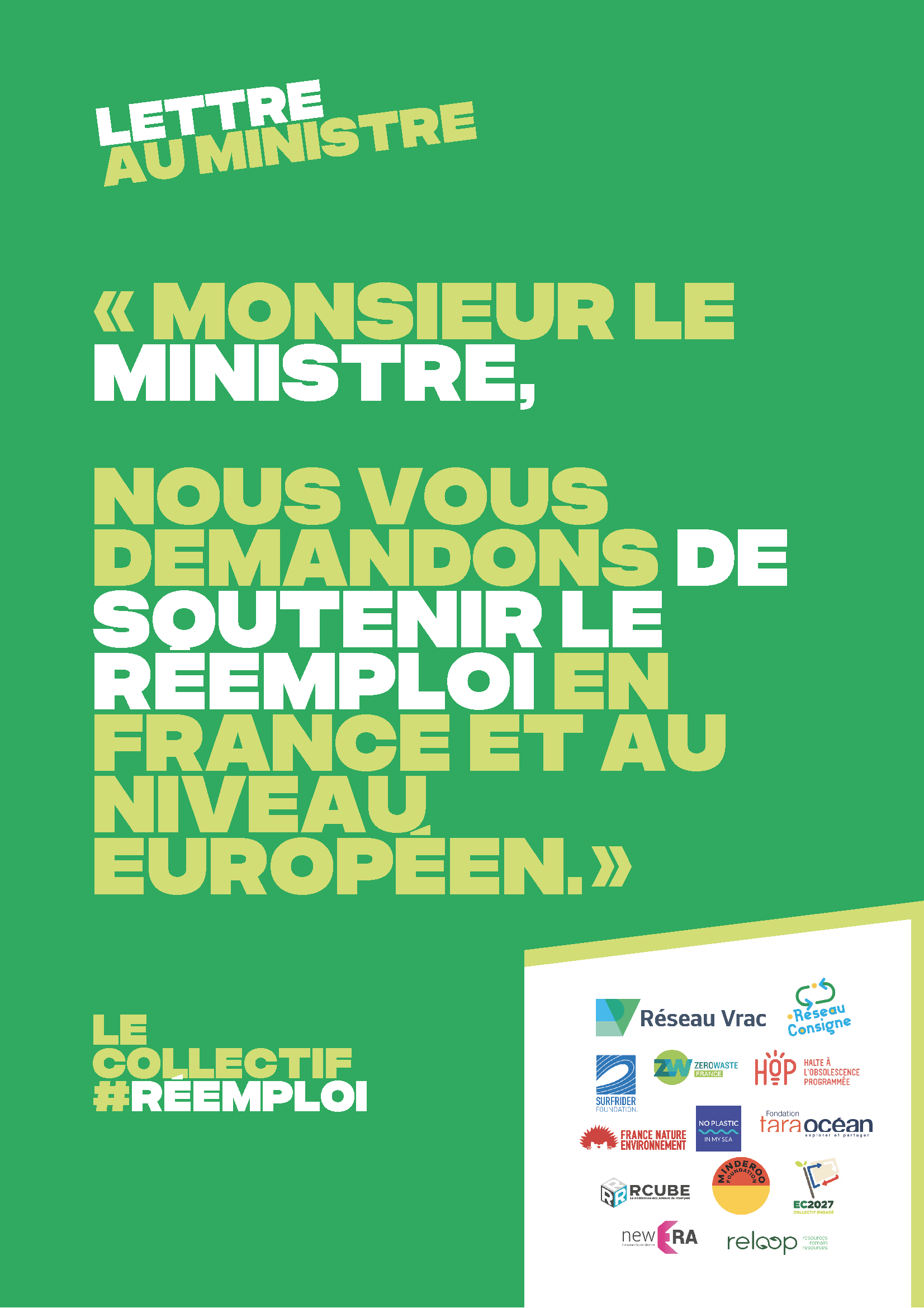 A l’initiative de l’association professionnelle Réseau Vrac & Réemploi, les acteurs associatifs (Fondation Tara Océan, France Nature Environnement, HOP, No Plastic in my Sea, Reloop, Surfrider Foundation Europe, Zero Waste France) et les représentants des acteurs de l’économie circulaire (Réseau Vrac & Réemploi, EC2027, Mouvement Impact France, New ERA, RCube) unissent leurs forces et présentent plusieurs propositions en faveur de la consigne nationale pour réemploi des emballages de boisson.
