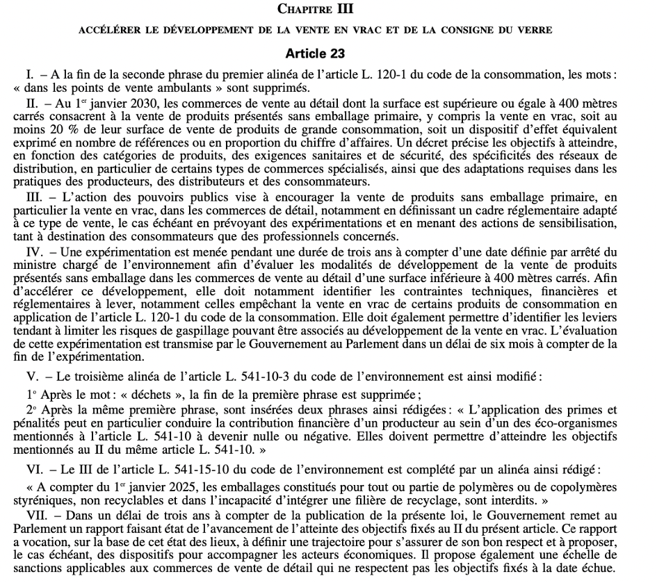 Nous attirons également votre attention sur les paragraphes V et VI de l’article 23 qui concernent respectivement la possibilité pour les metteurs en marché de réduire leur contribution financière auprès de leur éco-organisme, par un système de réduction des pénalités ou d’augmentation des primes qui pourront s’appliquer sur les produits mis en marché pour être vendus dans des contenants réutilisables, et l’interdiction à compter du 1er janvier 2025, des emballages constitués pour tout ou partie de polymères ou de copolymères styréniques, non recyclables et dans l’incapacité d’intégrer une filière de recyclage.