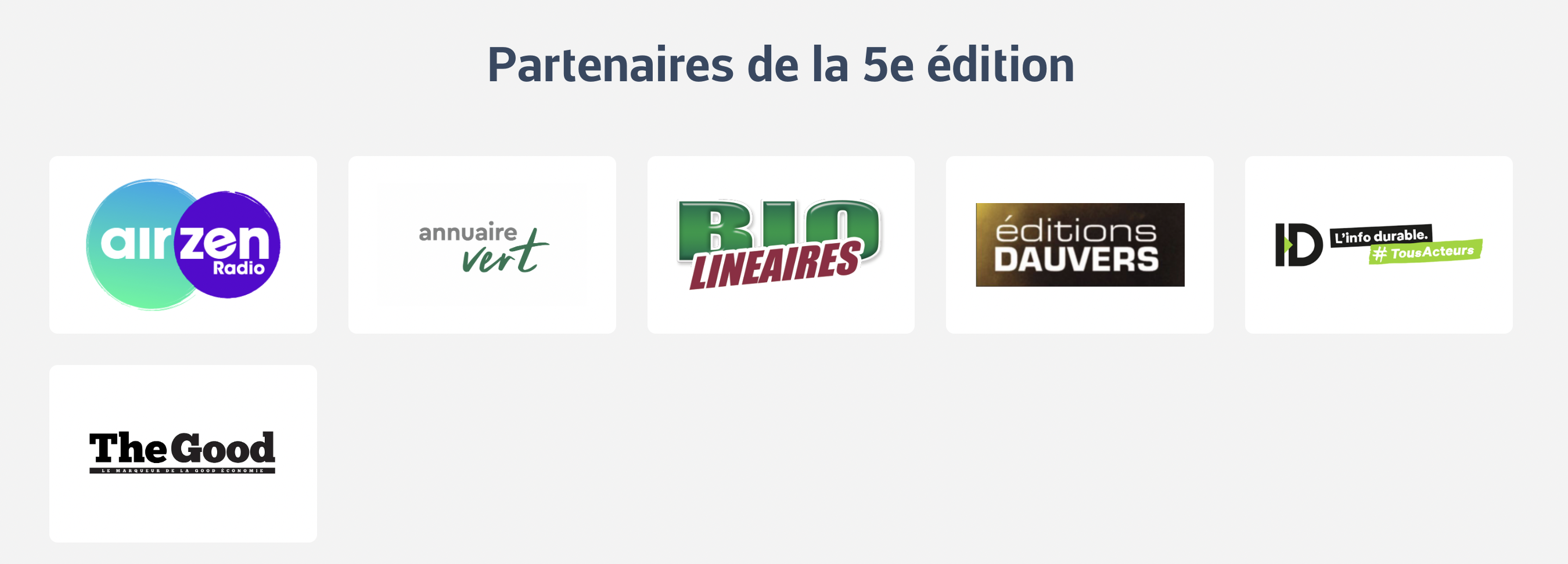 Merci également à l’ensemble des partenaires média qui nous ont aidé à mettre cette 5e édition en lumière : AirzenAnnuaire VertBiolineairesEditions DauversInfo DurableThe Good