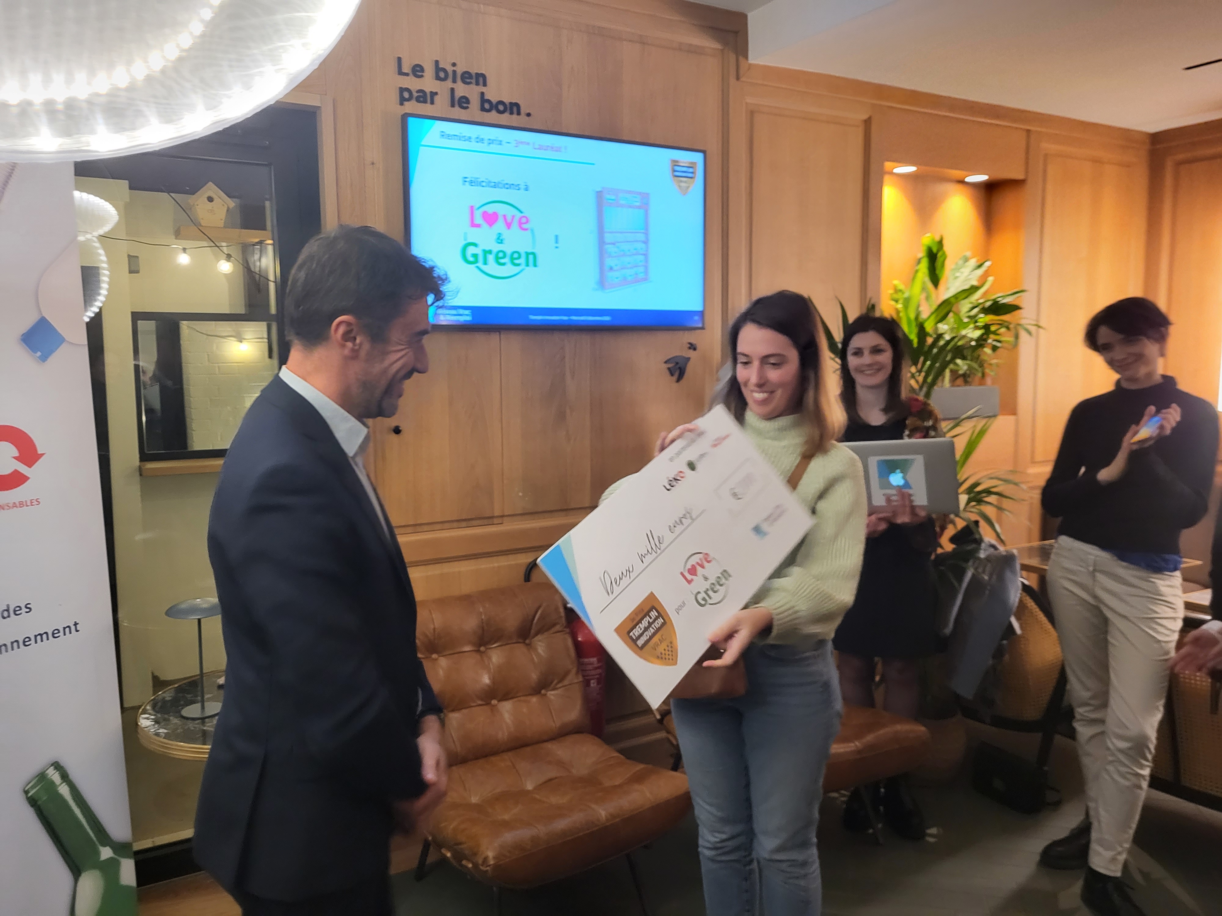 • 3e prix : Love & Green (dotation financière : 2000€) - Meuble lowtech pour distribuer des couches en vrac. La dimension innovante du projet porte sur la nature du produit : pour des raisons d’hygiène il était jusqu’alors très difficile de vendre des couches bébé en vrac. La marque love & green du groupe Green Family rend cela possible grâce à une innovation permettant de projeter les couches de l’air et du contact consommateur.