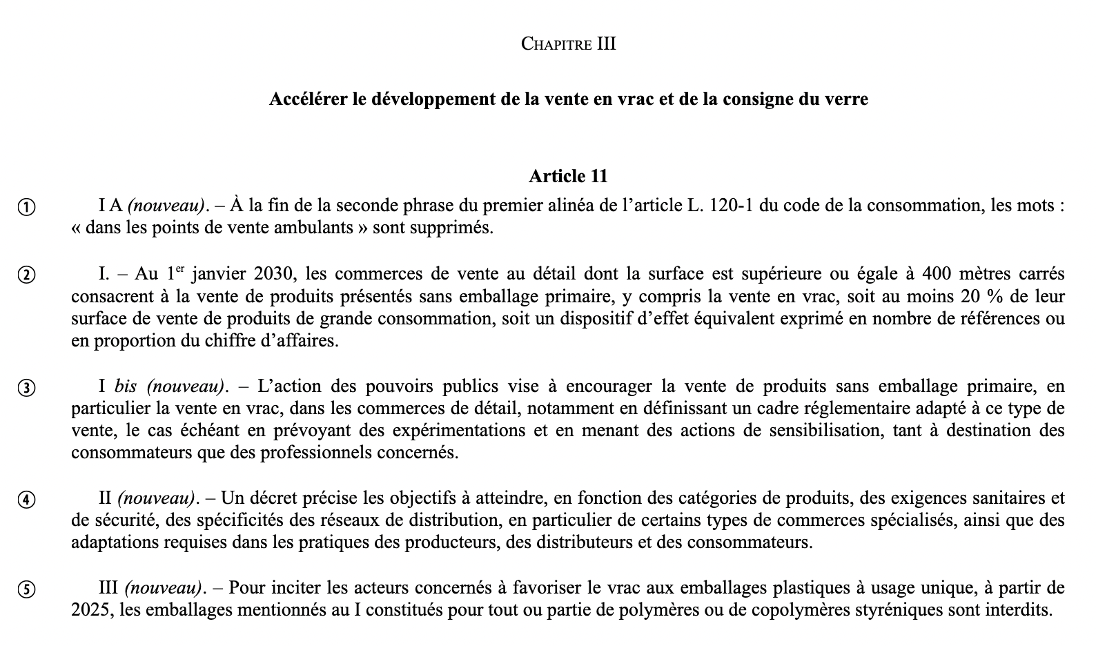 S’agissant de la filière vrac, l’association Réseau Vrac est très satisfaite de la place consacrée au vrac dans ce texte dans la mesure où, d’une part, il reprend la philosophie de la proposition initiale des citoyens visant à voir plus de rayons vrac dans les hypermarchés et supermarchés (commerces de plus de 400 m2), et où d’autre part, il va plus en loin en adoptant les propositions d’amendements de Réseau Vrac visant à développer la filière vrac dans son ensemble.