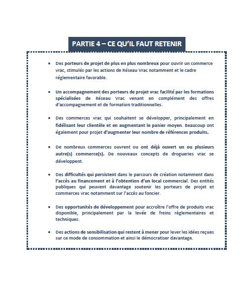 Organisé en 4 parties, le rapport complet s’attache tout d’abord à faire un état des lieux des commerces vrac en France avant d’étudier les caractéristiques des commerces et de leurs gérants. La troisième partie est consacrée aux données économiques (chiffre d’affaires, panier moyen, passages en caisse, emplois créés…). Le rapport se termine sur une partie prospective mettant en lumière des perspectives de développement encourageantes mais aussi les difficultés persistantes qu’il reste à lever pour pérenniser les commerces vrac partout sur le territoire.